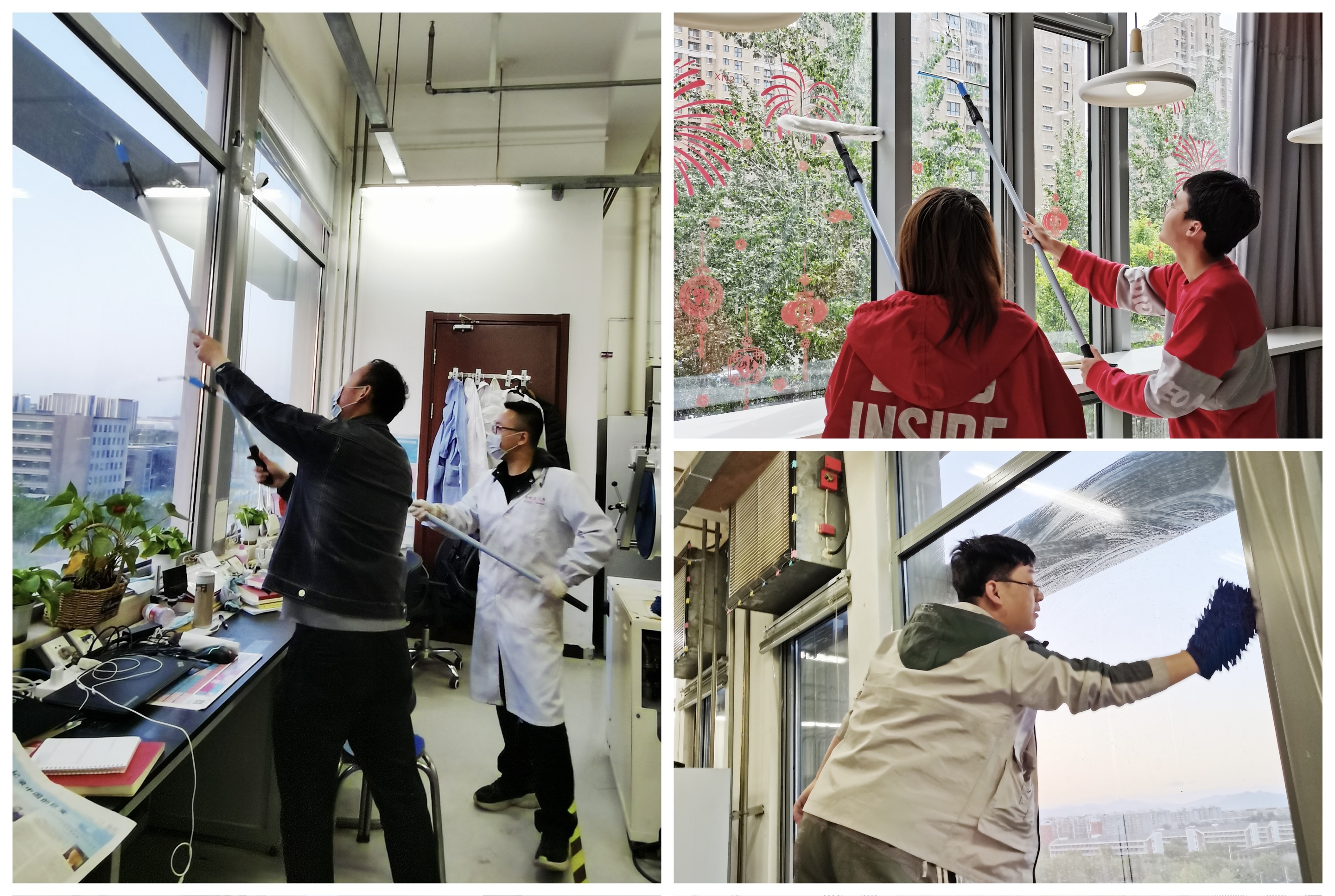 同时各个课题组党员带头弘扬劳动精神,发扬劳动最光荣、劳动最崇高、劳动最伟大、劳动最美丽的风气,纷纷拿起工具,清洁室内玻璃及实验室卫生。师生齐动手,环境展新颜。