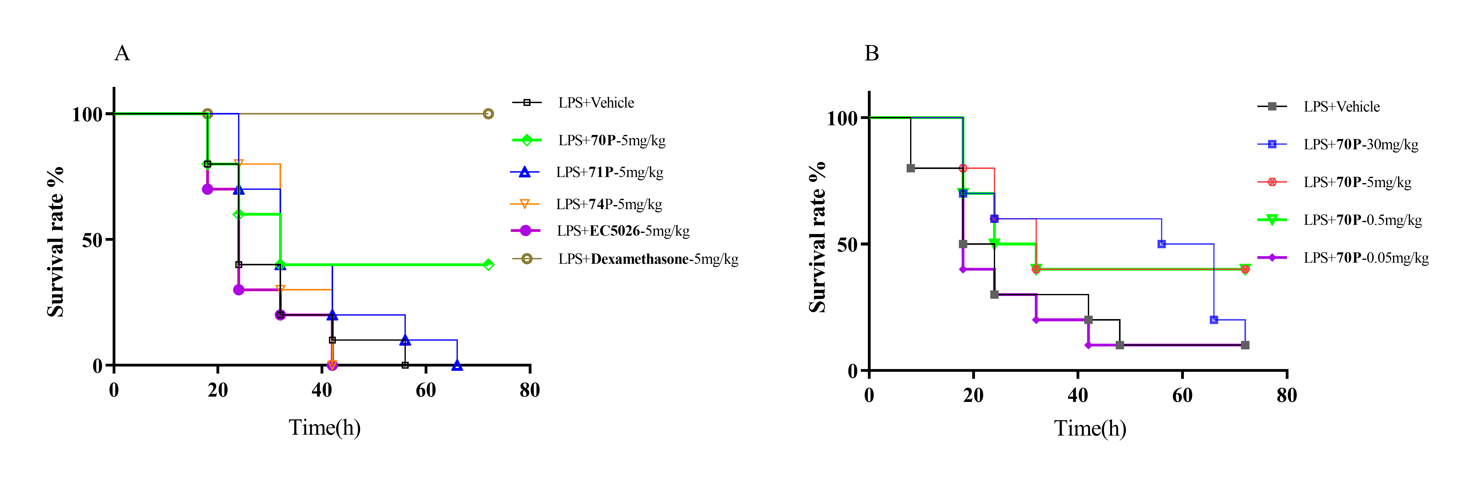 我们基于天然骨架二苯乙烯类先导化合物11D的构效关系进行设计优化,开发了一类新的sEH抑制剂,提升了酶水平的抑制活性,但对小鼠败血症模型没有明显效果。分子对接研究表明,延伸骨架后的化合物70P可以占据更多的靶蛋白空腔通道。体内量效实验表明,给药剂量在0.5 mg/kg到5 mg/kg范围内 70P均能够降低败血症诱导的小鼠死亡率,显著提高总生存率,而临床在研sEH抑制剂药物EC-5026在5 mg/kg时没有显示出疗效。此外,70P减少了败血症小鼠肝脏中的炎症因子水平,这可能是由70P在肝脏中的蓄积所促进的。