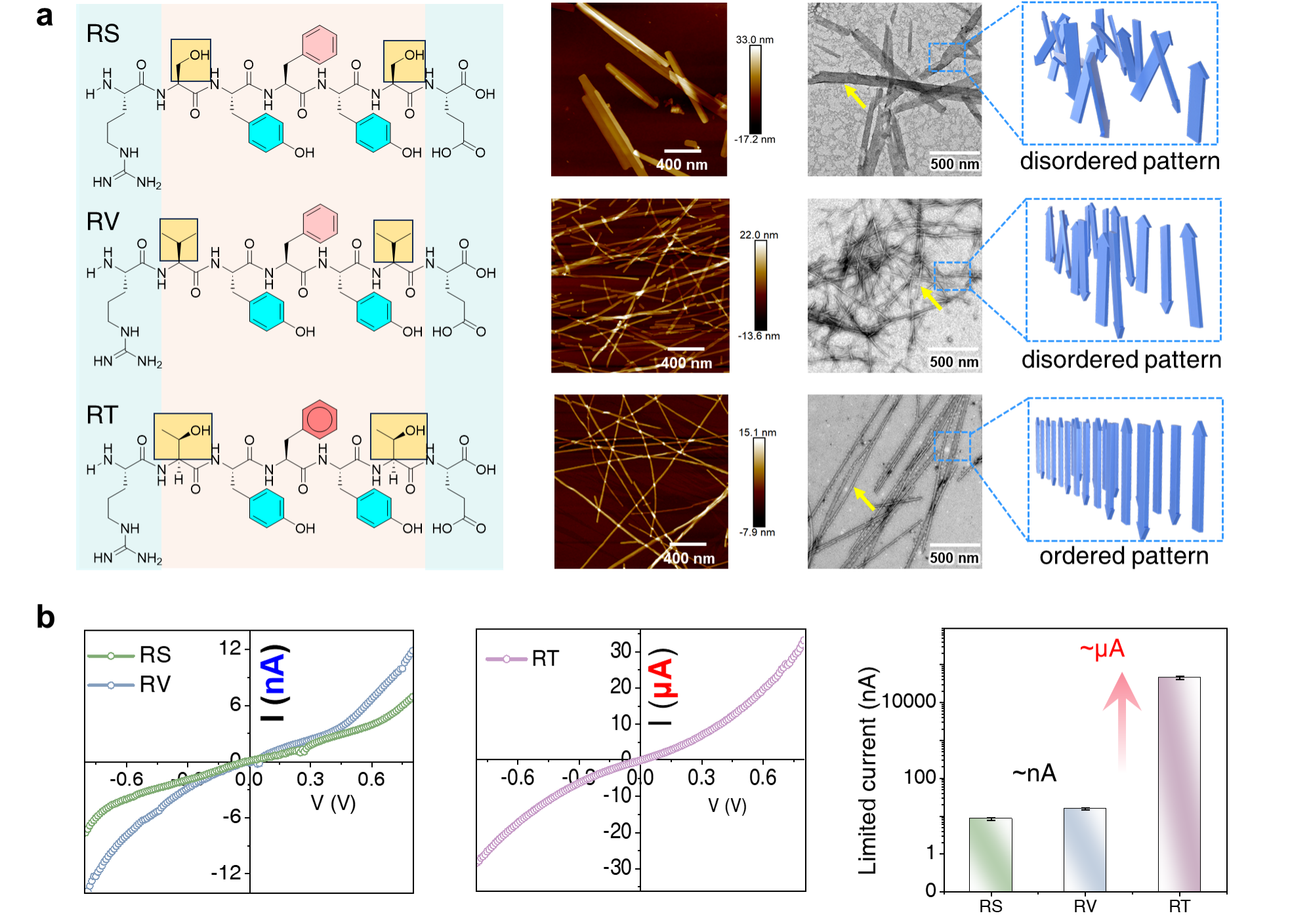 图2 多肽纳米形貌及性能表征。a) 多肽设计与组装形貌表征。b) 多肽导电性能表征。