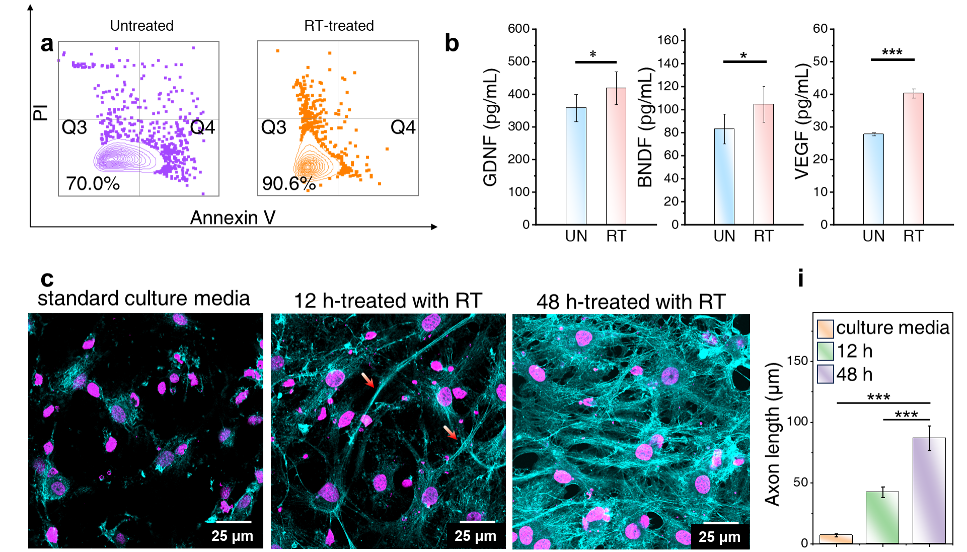 图3 神经损伤修复研究。a) RT促进神经细胞系活力提升。b) RT激活神经营养因子分泌。c) RT促进受损神经元修复。