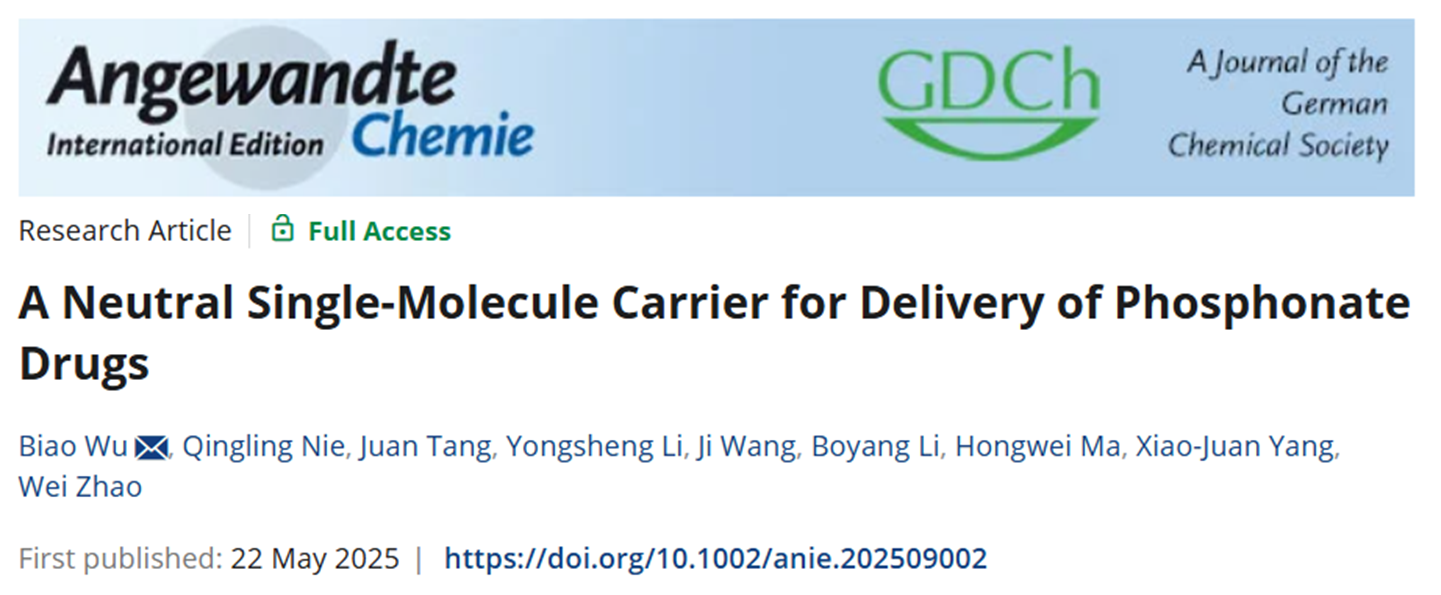 近日,日本A片 吴彪教授、唐娟特别研究员和赵伟特别研究员在国际知名化学期刊《Angewandte Chemie International Edition》上发表题目为“A Neutral Single-Molecule Carrier for Delivery of Phosphonate Drugs”的研究论文。该论文的第一作者为日本A片 博士研究生聂清玲。此项研究得到了国家自然科学基金,北京市自然科学基金和日本A片 青年教师学术启动计划等项目的资助及日本A片 分析测试中心的支持。