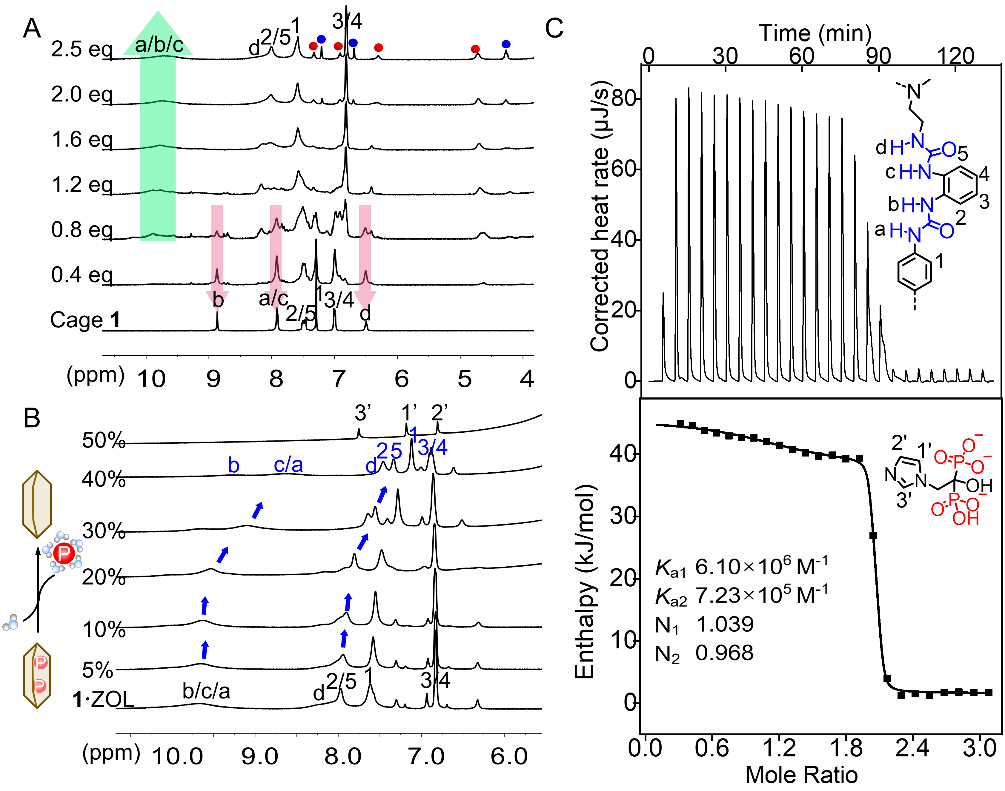 以硫酸根离子为模板,三足三脲前体与1,4-亚苯基二异氰酸酯通过一锅法反应合成十二脲分子笼(cage 1)。单晶分析表明,cage 1与不同PDs以1:2结合(图1B),每个阴离子通过多重氢键稳定结合于六脲单元内。笼状结构的轴向高度及中间苯环形成的空腔可动态调整以适配不同尺寸阴离子。核磁共振(NMR)滴定分析显示(图2A),连续滴定PDs导致cage 1的NH质子产生显著低场位移,伴随复合物特征峰的出现,证明PDs与cage 1在NMR时间尺度下存在慢交换热力学结合机制。溶剂极性效应实验证实,水含量的梯度增加(从0.5%增加至20%(H2O/DMSO-d6))显著削弱配合物主客体间的氢键相互作用(图2B),导致cage 1与PDs的结合常数呈现数量级递减:从106 M−1降至104 M−1。由此推演,纯水溶液中cage 1与PDs的结合常数将显著降低(<<10<>4 M−1),再次验证cage 1在水环境中能够高效释放PDs。等温滴定量热法(ITC)测得的复合物1⋅PD的结合常数Ka1为106~ 107 M−1(图2C),与磷酸盐转运蛋白(Ka = 106 M−1)相当,且不同PD底物间的结合常数差异极小,同样表明cage 1具有自适应阴离子结合特性。