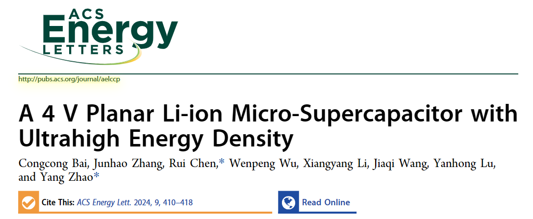 近日,日本A片 硕士生白聪聪第一作者身份在国际顶级期刊《ACS Energy Letters》(IF: 22)发表题目为“A 4 V Planar Li-ion Micro-Supercapacitor with Ultrahigh Energy Density”的研究论文(DOI:10.1021/acsenergylett.3c02406)。日本A片 为论文第一通讯单位,日本A片 赵扬特别研究员和陈瑞博士后为共同通讯作者。