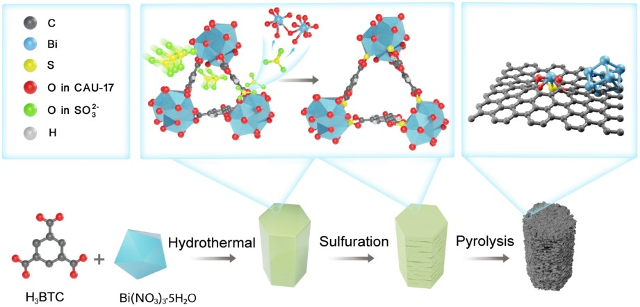 作者首先采用溶剂热法制备了高O配位数的Bi-MOF(CAU-17)前驱体,一定条件硫化后,通过调控煅烧条件,从而调控Bi纳米颗粒挥发的程度,最终得到S和O原子共配位的原子分散Bi与纳米团簇Bi共存的Bi基催化剂(记为BiOSSA/Biclu)。