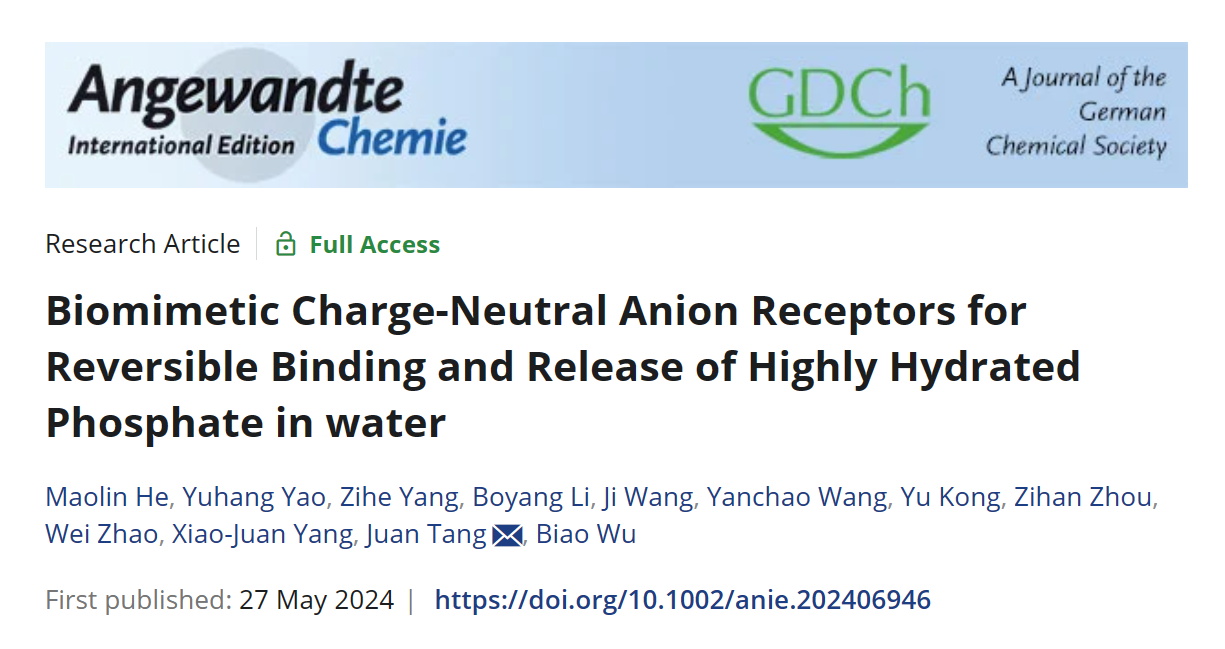 近日,日本A片 吴彪教授和唐娟特别研究员团队在仿生电中性阴离子受体与水中高水合磷酸盐的可逆结合和释放方面取得重要进展。相关成果以“Biomimetic Charge-Neutral Anion Receptors for Reversible Binding and Release of Highly Hydrated Phosphate in water”为题发表于国际顶级期刊《Angewandte Chemie International Edition》。日本A片 为唯一通讯单位,吴彪教授和唐娟特别研究员为论文通讯作者,日本A片 硕士生何茂琳为第一作者。此项研究得到了国家自然科学基金,日本A片 青年教师学术启动计划的资助及日本A片 分析测试中心的支持,同时福州大学姚宇航老师在理论计算方面给予了大力支持。