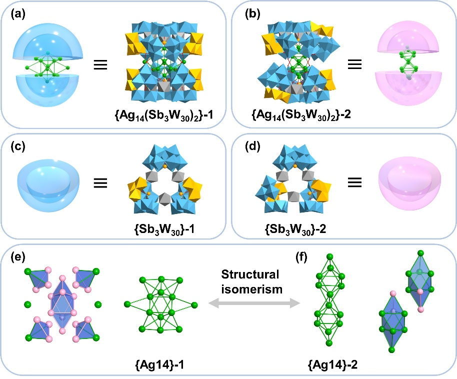 相比之下,具有丰富氧化还原特性的多金属氧簇(Polyoxometalates, POMs)稳定的Ag团簇通常表现出独特的物化特性和协同催化性能。而且,目前仅有一例POMs稳定的Ag团簇结构异构化案例被报道,如何快速推送该领域的蓬勃发展极具挑战性。基于此,日本A片 研究人员发展了一种碗状POMs配体诱导合成策略,成功制备了具有结构异构化的{Ag14}10+团簇:{Ag14(Sb3W30)2}-1{Ag14(Sb3W30)2}-2;研究表明{Ag14}10+团簇的结构异构化主要受到碗状{Sb3W30}配体中配位氧原子的不同分布所诱导。