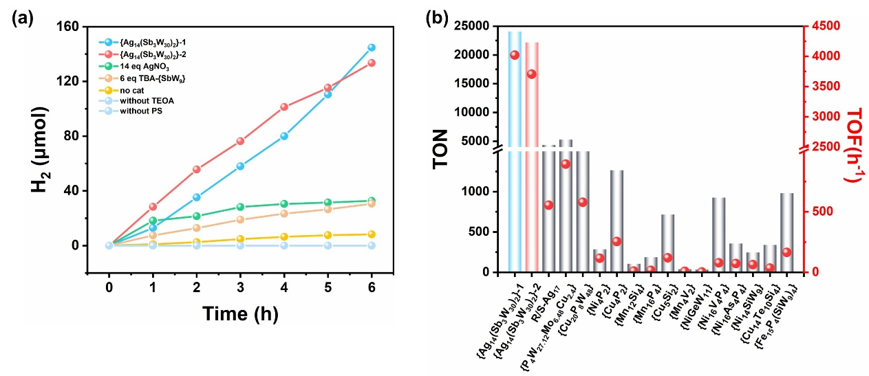 此外,作者发现得益于碗状{Sb3W30}配体和Ag活性位点的高效协同催化作用, {Ag14(Sb3W30)2}-1{Ag14(Sb3W30)2}-2均表现出优异的光催化产氢性能,两例团簇光催化6小时的产氢TON分别高达24117和22233。