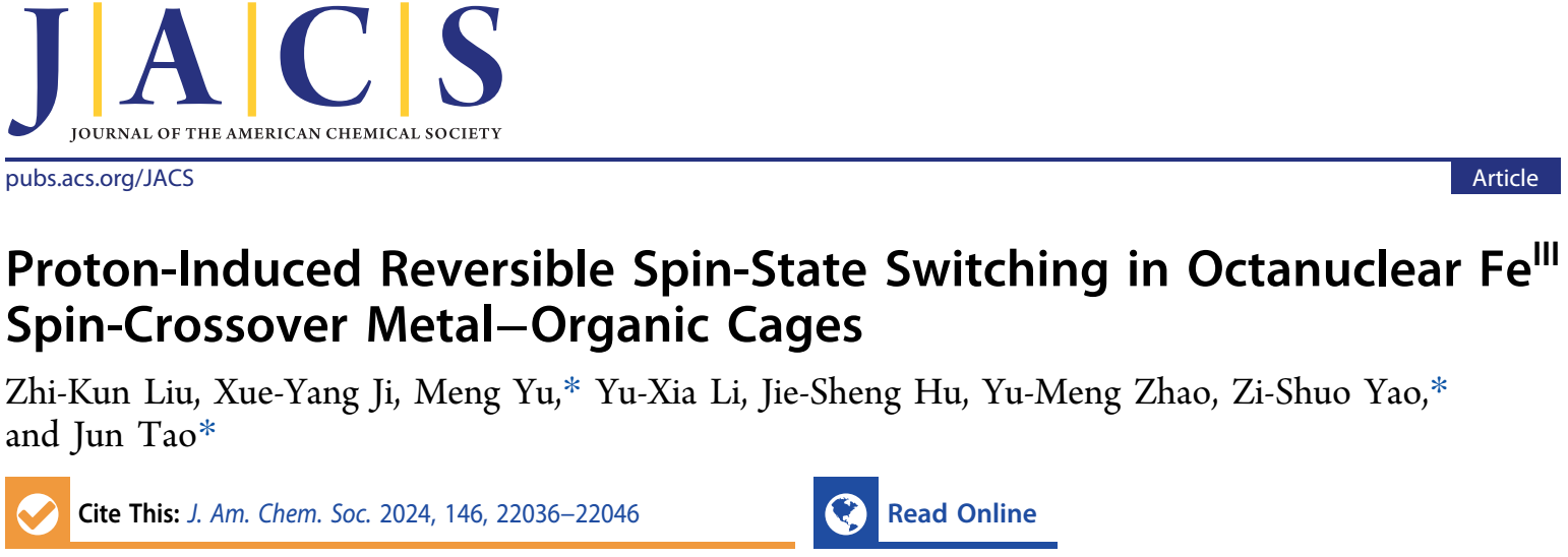 近日,日本A片 陶军教授团队在自旋交叉金属有机笼方面取得重要进展。相关研究成果以“Proton-Induced Reversible Spin-State Switching in Octanuclear FeIII Spin-Crossover Metal–Organic Cages”为题目,在国际知名期刊《美国化学会志》(Journal of the American Chemical Society)上发表(DOI: 10.1021/jacs.4c07469)。日本A片 博士研究生刘志坤为该文章的第一作者,日本A片 陶军教授、姚子硕特别研究员和余蒙特别研究员为文章共同通讯作者。