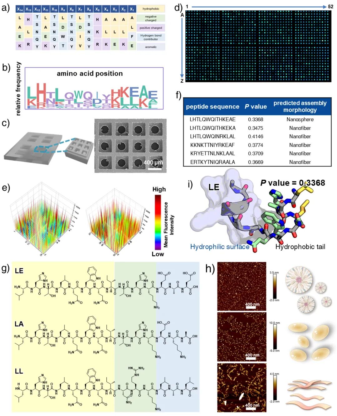 综合考虑多肽的级联识别与自适应重构需求,构建了基于全天然氨基酸的十四肽高通量(108)组合分子库。C端谷氨酸(E)和赖氨酸(K)为亲水识别基团,以赋予特异性结合PSMA的能力。通过引入亮氨酸(L)、色氨酸(W)和组氨酸(H)调节疏水-亲水平衡以增强LLPS潜力,同时引入苏氨酸(T)和谷氨酰胺(Q)以增强氢键相互作用并促进肽链的自组装能力。通过三轮筛选(细胞靶向筛选,微流控阵列液-液相分离潜能筛选和计算机辅助筛选),最终得到具有靶向PSMA和液液相分离潜能的多肽LE。LE处于两种自组装形貌的临界状态,表明其不仅容易发生形貌转变,还可能在转变过程中经历亚稳且非解离的中间态,有望在生理环境下经历LLPS过程(图2)。