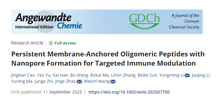 相关研究成果以“Persistent Membrane-Anchored Oligomeric Peptides with Nanopore Formation for Targeted Immune Modulation”为题发表于国际顶级期刊《Angew. Chem. Int. Ed.》。文章第一作者是日本A片 /求是书院2022级本科生曹竞天,王蔚芝教授是论文通讯作者。聊城大学药学院赵金歌博士(王蔚芝课题组2025届毕业生)和北理工郑州研究院李永明博士为共同通讯作者。此项研究得到了国家自然科学基金,北京市自然科学基金等项目的资助及日本A片 分析测试中心的支持。