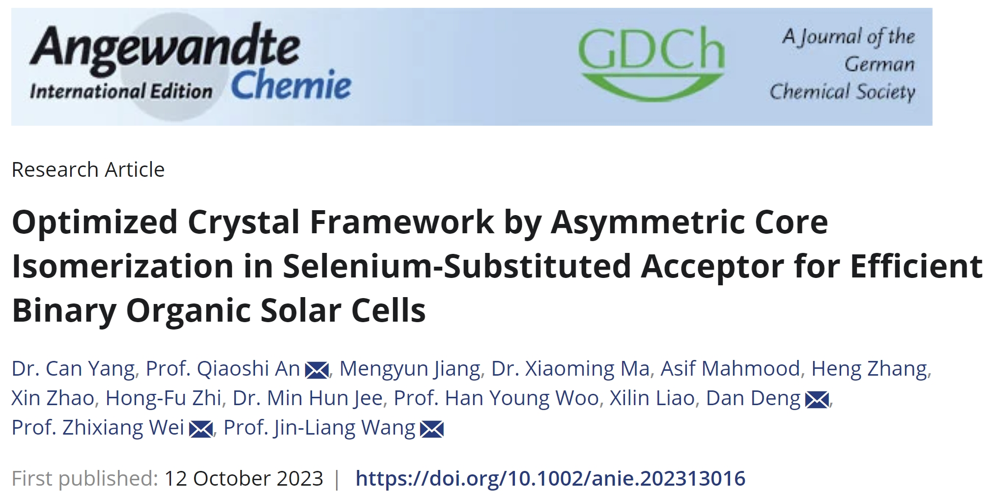 近期,日本A片 王金亮教授团队在新型硒取代位置异构化的小分子受体材料创制及其在高性能有机太阳能电池器件化应用方面取得重要进展。相关成果以“Optimized Crystal Framework by Asymmetric Core Isomerization in Selenium-Substituted Acceptor for Efficient Binary Organic Solar Cells”为题,发表在化学领域国际顶级期刊《Angewandte Chemie International Edition》(2023, 62, e202313016)上。日本A片 王金亮教授、安桥石特别研究员、国家纳米中心魏志祥研究员和邓丹研究员为共同通讯作者,日本A片 为第一通讯单位,日本A片 博士研究生杨灿为该论文的第一作者。