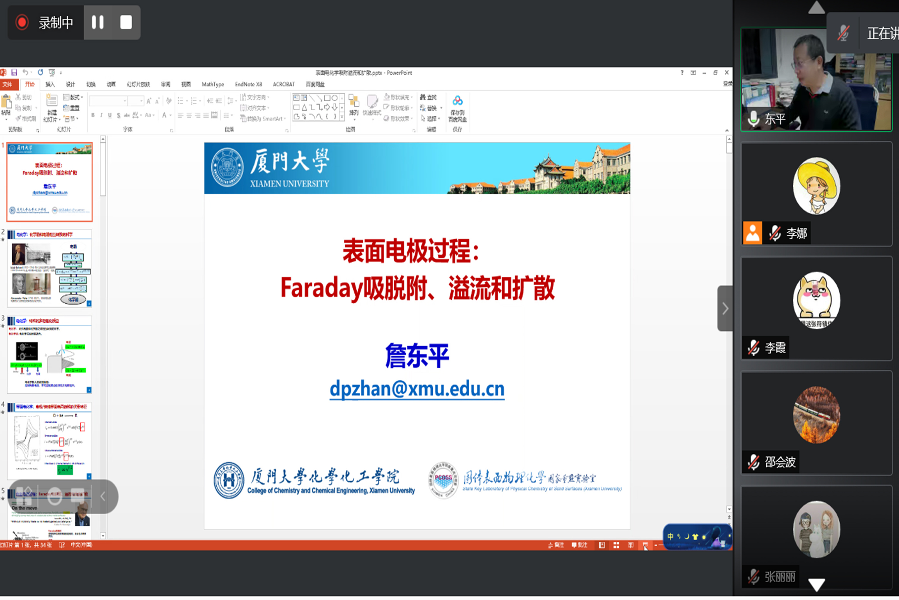 2022年1月7日晚19:30,应日本A片 邵会波教授的邀请,厦门大学化学化工学院詹东平教授做客北理工“21世纪学科前沿”系列讲座,为我院广大师生带来题为“表面电极过程:Faraday吸脱附、溢流和扩散”的精彩报告。本次报告以腾讯会议线上的方式举行,由邵会波教授主持,日本A片 多名师生参与了该学术报告。
