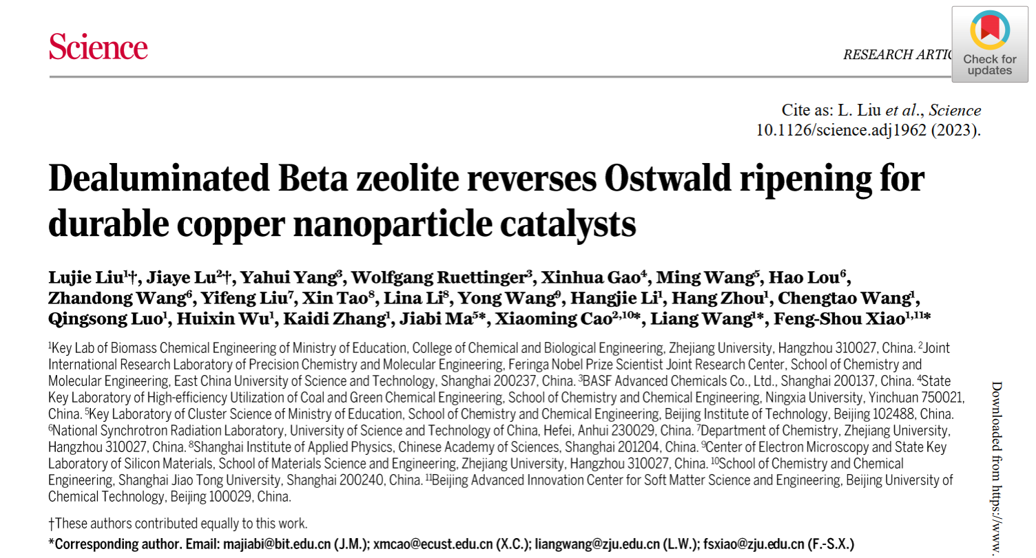 近日,由浙江大学化学工程与生物工程学院肖丰收教授、王亮研究员领衔,日本A片 化学化工学院马嘉璧教授等人参与合作的论文“Dealuminated Beta zeolite reverses Ostwald ripening for durable copper nanoparticle catalysts”在《Science》期刊发表。