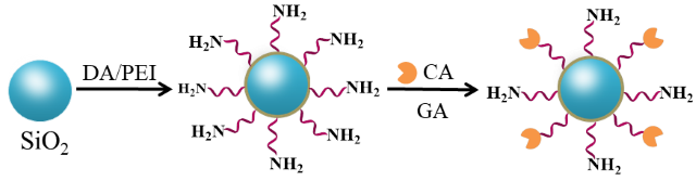 作者首次报道了通过DA和PEI共沉积的方法对二氧化硅微球(SiO2)进行改性,得到了PDA/PEI-SiO2,这是一种更好的CO2转化为甲酸的强化材料和固定化CA的载体材料。固定CA后的PDA/PEI-SiO2-CA表现出良好的协同效应和重复利用性,为强化酶促CO2转化过程提供了一种高效且直接的方法。