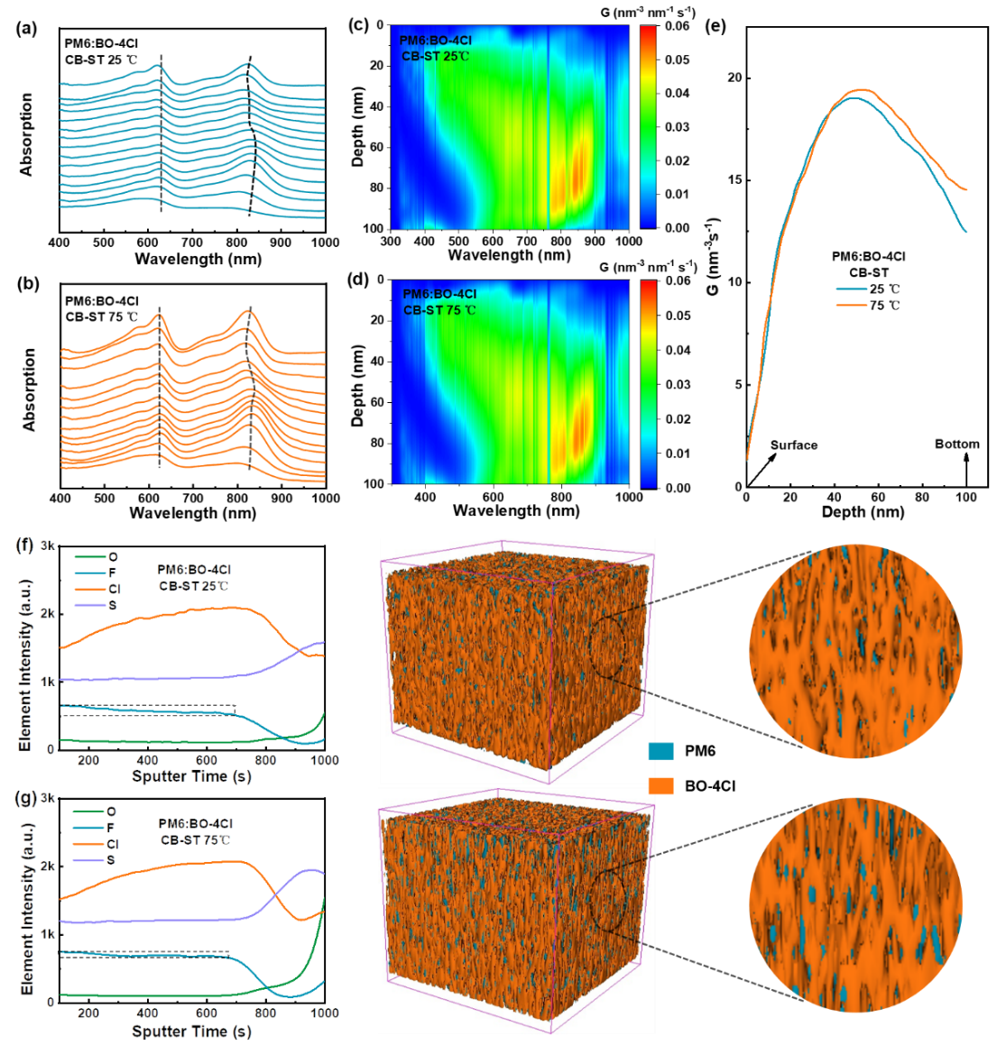 图1. (a) PM6, BO-4Cl分子式。(b) PM6, BO-4Cl, 界面层和电极的能级示意图。(c) 不同工艺有源层制备示意图。(d) PM6, (e) BO-4Cl和(f) PM6:BO-4Cl溶液的变温吸收光谱。