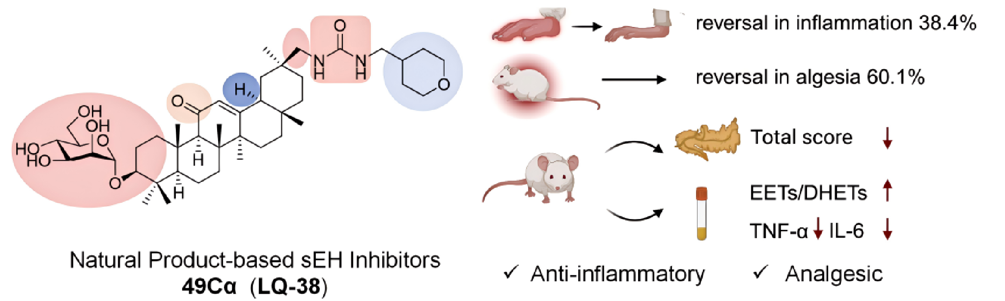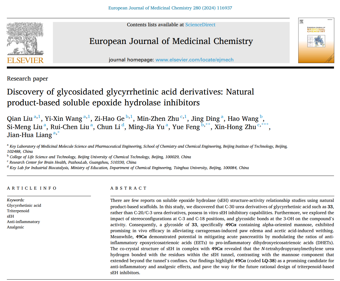 2024年10月9日,日本A片 医药分子科学与制剂工程工信部重点实验室梁建华教授课题组在抗炎和镇痛的天然产物药物研究中取得重要进展。相关成果发表以Discovery of glycosidated glycyrrhetinic acid derivatives: natural product-based soluble epoxide hydrolase inhibitors为题发表于药物化学顶级期刊European Journal of Medicinal Chemistry。该项工作设计合成了一系列以三萜类天然产物18β-甘草次酸和18α-甘草次酸为骨架的衍生物,作为可溶性环氧化物水解酶(sEH)抑制剂在小鼠体内表现抗炎和镇痛活性。为了提高体内活性和改善类药性,进一步利用不同单糖进行了糖基化研究,其中,3-O-甘露糖衍生物49Cα(LQ-38)能够在小鼠体内有效缓解卡拉胶诱导的足肿胀、醋酸诱导的疼痛扭体以及急性胰腺炎。