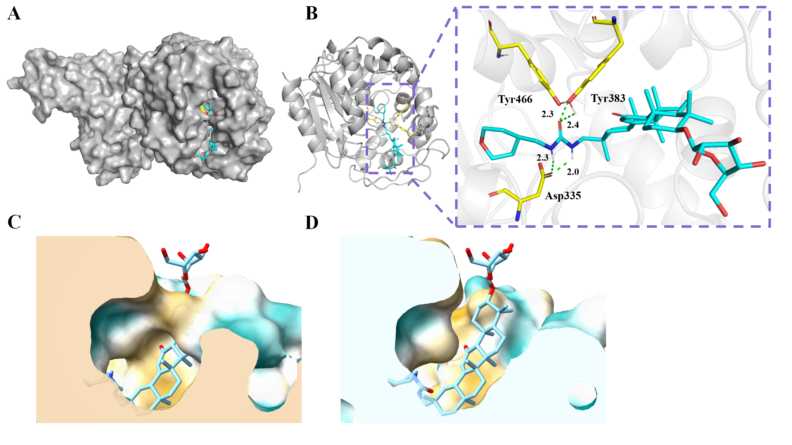目前,针对不同适应症的三种sEH抑制剂已经进入了临床研究阶段,但目前只剩下EC5026还在临床研究中(I期)。然而基于天然产物的sEH抑制剂在研究和开发工作中仍然没有显著性进展。天然产物是有临床效药物的重要来源,具有广泛的药理作用,并具有规避靶标抑制引起的药物耐受性的潜力。我们基于三萜类骨架的构效关系进行迭代设计优化,终于发现C-30甘草次酸脲基衍生物具有优异的体外sEH抑制活性,而C-20或者C-3脲基衍生物无抑制活性;但不足的是其体内活性较低。因此,为了提高体内的生物利用度,我们进一步探讨了3-OH上的连接不同单糖基、糖苷键构型以及C-18位置的立体构型对体内活性的影响。发现含有α糖苷键的18α-甘草次酸甘露糖衍生物49Cα,在缓解卡拉胶诱导的足肿胀和醋酸诱导的疼痛扭体显示出良好的体内药效;同时,化合物49Cα通过调节EETs与DHETs的比例,显示出治疗急性胰腺炎的潜力。为了研究作用模式,我们培养了sEH与候选化合物49Cα的共结晶,其复合物分子结构表明,关键药效团脲基与sEH隧道内的氨基酸残基以氢键形式结合,三萜骨架与疏水性的sEH通道作用,而甘露糖成分则延伸到sEH通道外。