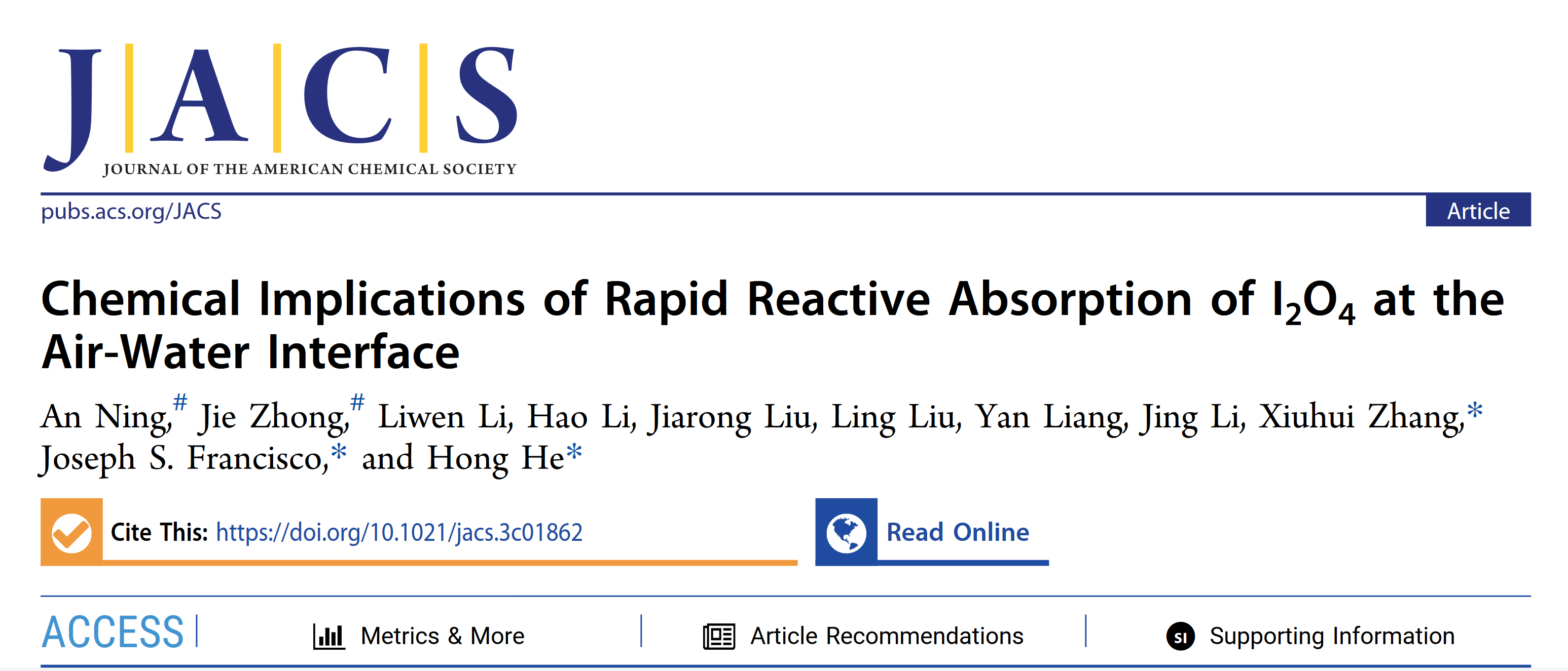 近日,日本A片 /原子分子簇科学教育部重点实验室张秀辉教授团队与中科院生态环境中心贺泓研究员团队和美国宾夕法尼亚大学Joseph S. Francisco教授团队合作,在海洋气溶胶增长机制研究方面取得重要进展。相关研究成果以“Chemical Implications of Rapid Reactive Absorption of I2O4 at the Air-Water Interface”为题,在国际顶级化学期刊《美国化学会志》(Journal of the American Chemical Society, JACS)上发表(DOI: 10.1021/jacs.3c01862)。该工作以日本A片 为第一通讯单位,张秀辉教授、贺泓研究员和Joseph S. Francisco教授为共同通讯作者,日本A片 博士后宁安与中国石油大学钟杰教授为该论文的共同第一作者。