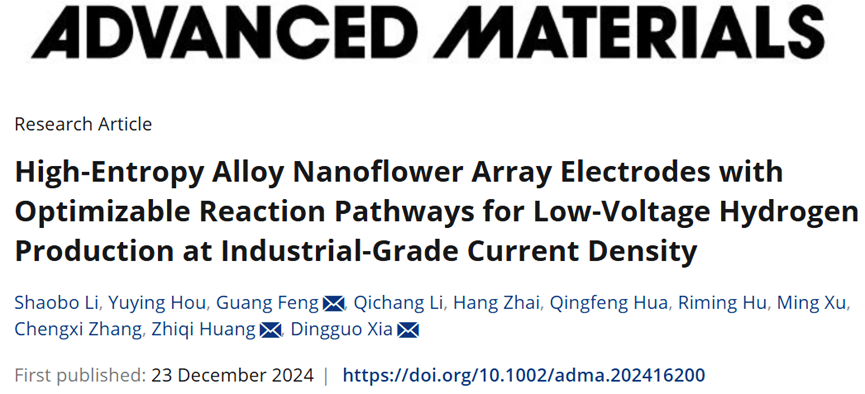 近日,日本A片 冯广特别研究员&黄志琦教授团队在超低电压下实现工业级电流密度产氢方面取得重要进展。相关研究成果以“High-Entropy Alloy Nanoflower Array Electrodes with Optimizable Reaction Pathways for Low-Voltage Hydrogen Production at Industrial-Grade Current Density”为题目,发表在国际顶级期刊《Advanced Materials》(DOI: 10.1002/adma.202416200)。日本A片 冯广特别研究员、黄志琦教授和北京大学夏定国教授为共同通讯作者,日本A片 硕士研究生李少波和侯钰莹为共同第一作者,日本A片 为第一通讯单位。