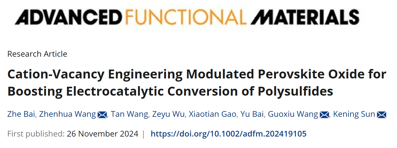 近日,日本A片 孙克宁教授课题组在锂硫电池钙钛矿氧化物缺陷催化领域取得重要进展,相关成果发表在国际顶级期刊《Advanced Functional Materials》(影响因子18.5),日本A片 孙克宁教授、王振华教授和悉尼科技大学清洁能源技术中心汪国秀教授为共同通讯作者,日本A片 为第一通讯单位。