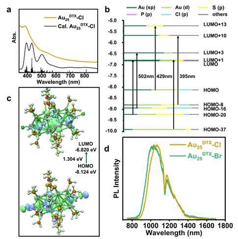 图3. Au25DTX-Cl和Au25DTX-Br UV-Vis吸收光谱,发射谱图及DFT相关计算结果