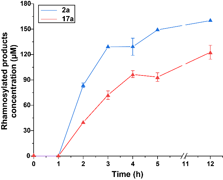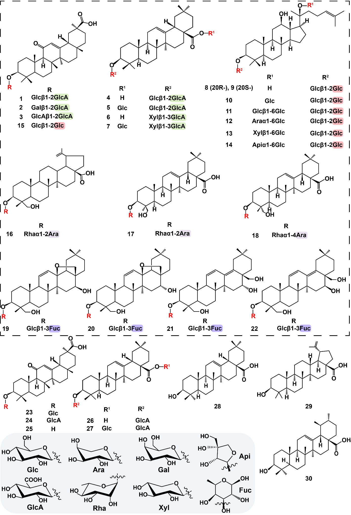 本研究首先对7个UGT91H亚家族酶进行系统性表征,结果表明7个UGTs对14个三萜化合物有催化活性,特异性的在其C2''-OH修饰一分子糖基,成功合成26个三萜直链三糖苷。揭示了7个UGT91H亚家族酶催化糖基受体底物的结构特点:仅可催化在C3-OH修饰二糖基且第一个糖基为葡萄糖醛酸基或葡萄糖基的三萜化合物,而对三萜苷元或三萜单糖苷则没有催化活性。另外,7个UGTs对UDP-糖基供体具有较为严格的特异性,对UDP-鼠李糖(UDP-Rha)具有最高的偏好性,对UDP-木糖(UDP-Xyl)次之,而对其他UDP-糖供体则没有催化活性。
