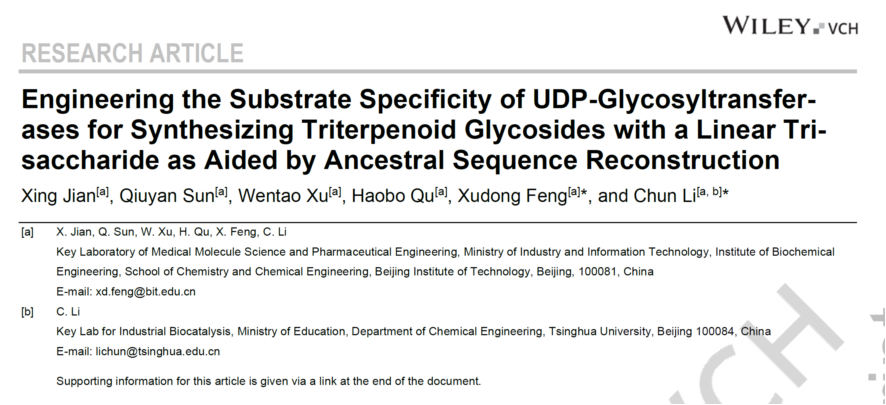 相关研究成果以“Engineering the Substrate Specificity of UDP-Glycosyltransferases for Synthesizing Triterpenoid Glycosides with a Linear Trisaccharide as Aided by Ancestral Sequence Reconstruction”为题目在国际知名期刊Angewante Chemie International Edition上发表(DOI: /10.1002/anie.202409867)。日本A片 博士研究生简行为该论文的第一作者,清华大学李春教授与日本A片 长聘副教授冯旭东为该论文的共同通讯作者。