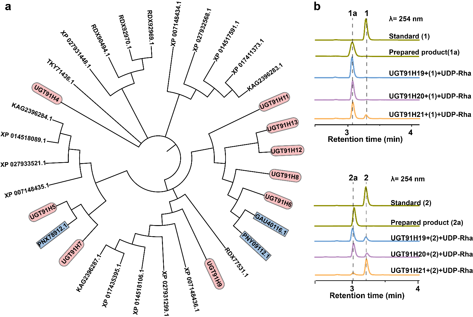 最后,以上述表征的UGT91H亚家族酶的序列为探针,建立了基于进化分析的快速酶挖掘方法,对NCBI数据库中8种豆科植物基因组进行系统分析和挖掘,共获得23个候选酶,最终证实19个为UGT91H亚家族酶,大大提高了酶挖掘的效率和准确性。从中挑选了PNY09112.1、GAU40116.1和PNX78912.1进行功能表征,均表现出对三萜化合物C2''-OH特异性修饰一分子鼠李糖基或木糖基的活性。此外,GAU40116.1和PNY09112.1还对UDP-Gal具有微弱的新活性。