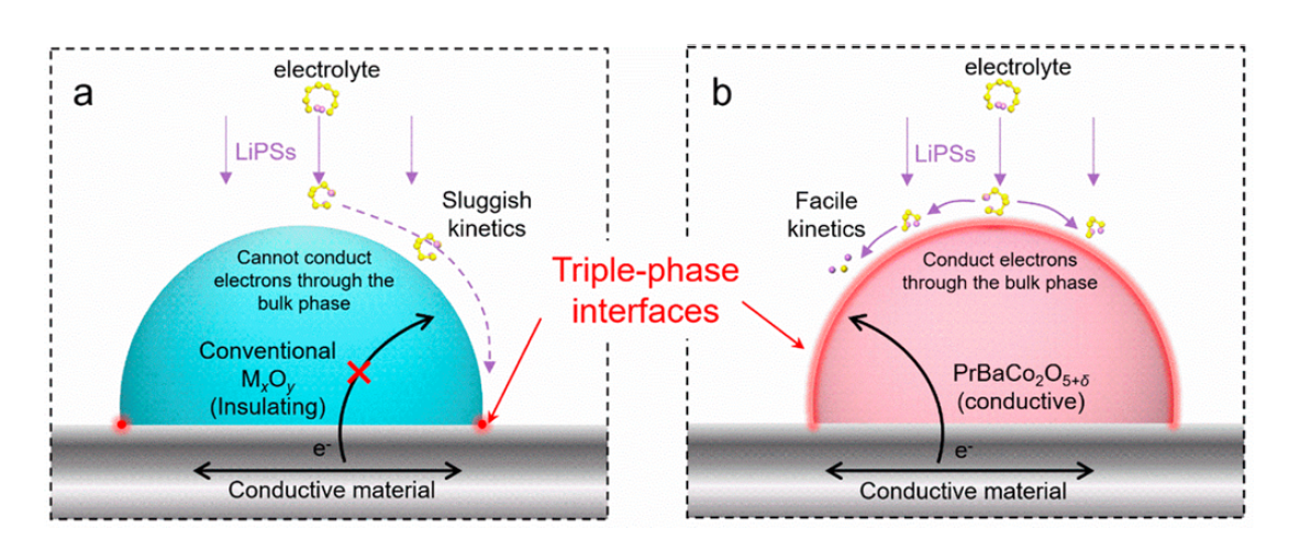 图1. 多硫化物在传统氧化物和PBCO表面的催化过程示意图