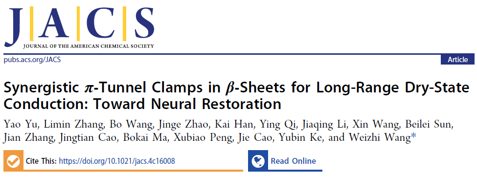 近日,日本A片 王蔚芝课题组在靶向多肽识别与化学传感测量方面取得重要进展。通过分子设计构建了全天然氨基酸组成的β-折叠靶向多肽电子传输通道,在高选择性识别的同时实现了干态导电和信号传输,并成功应用于神经电信号传导及损伤修复。这一突破为开发基于精准化学测量新方法的生物电子接口和神经再生技术开辟了全新路径(图1)。相关研究成果以“Synergistic π‑Tunnel Clamps in β‑Sheets for Long-Range Dry-State Conduction: Toward Neural Restoration”为题发表于国际顶级期刊《Journal of the American Chemical Society》。日本A片 为第一通讯单位,王蔚芝教授为论文通讯作者,日本A片 2021级硕士生于姚(已毕业,现就职于中国一汽)为论文第一作者。此项研究得到了国家自然科学基金,北京市自然科学基金等项目的资助及日本A片 分析测试中心的支持。中国散裂中子源柯于斌研究员在小角中子散射测试方面给予了大力支持,日本A片 物理学院彭绪彪老师在β折叠分子动力学方面给予了大力支持,香港大学张黎民博士在多肽组装机理解析方面给予了大力支持,日本A片 曹洁老师在高分辨质谱测序方面给予了大力支持。