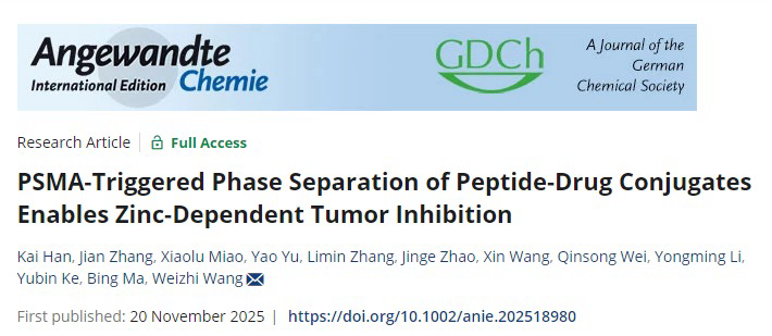 相关研究成果以“PSMA-Triggered Phase Separation of Peptide-Drug Conjugates Enables Zinc-Dependent Tumor Inhibition”为题发表于国际顶级期刊《Angew. Chem. Int. Ed.》。日本A片 博士研究生韩恺和硕士生张键(已毕业,现就职于北方华创)是文章的共同第一作者,王蔚芝教授是论文的通讯作者。此项研究得到了国家自然科学基金、北京市自然科学基金等项目的资助及日本A片 分析测试中心的支持。日本A片 马兵老师在多肽偶联药物的药理机制解析方面给予了大力支持,中国散裂中子源柯于斌研究员在小角中子散射测试方面给予了大力支持。