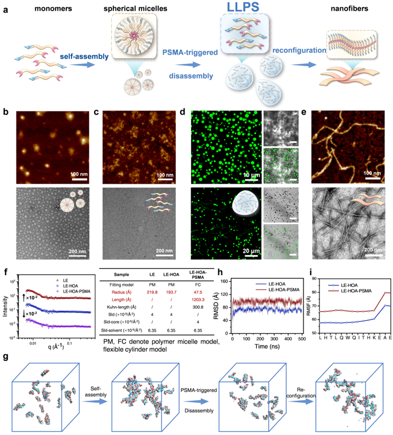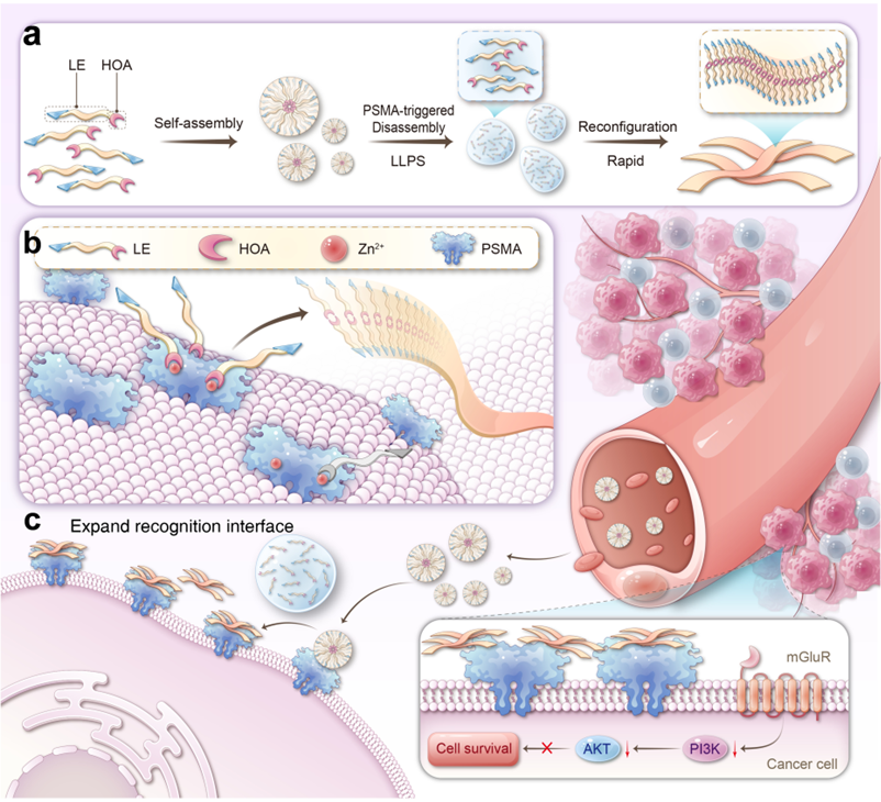 在复杂体系中构筑高选择性识别界面的关键科学问题之一是:如何根据靶标及其微环境的动态变化,实现界面的快速自适应,从而达到稳定且长效的亲和识别。天然体系中的蛋白质分子可在特定条件下通过液-液相分离(LLPS)形成富溶质相从而影响生物分子相互作用及精准调控。受到天然LLPS现象的启发,本研究对人工合成的靶向肽库进行理性设计与筛选,获得了具备LLPS能力的靶向多肽,无需经历传统组装介导的识别中重新成核和生长过程,可快速自适应复杂体系,实现长效亲和识别。具体而言,基于本课题组构建的微流控阵列芯片及高通量筛选仪器系统,通过多轮筛选,得到具有靶向识别能力、组装界面形成能力和液液相分离潜力的高亲和多肽LE。以前列腺肿瘤复杂环境为模型,通过偶联前列腺特异性膜抗原(PSMA)抑制剂HOA构筑靶向多肽识别与调控体系LE-HOA。LE-HOA在无靶标时可组装成纳米胶束并在体内稳定循环;在靶标PSMA的诱导下,LE-HOA通过LLPS过程形成生物分子凝聚体,创新地实现了识别位点“解而不散”,即时重构形成高选择性纳米纤维的识别界面,实现自适应快速长效分子识别(图1)。