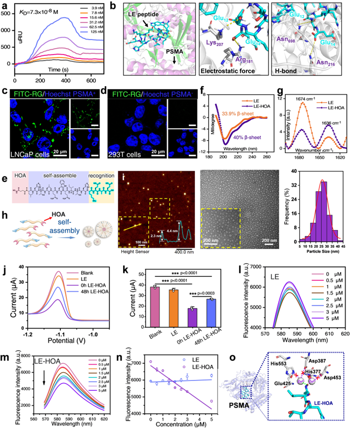 通过表面等离子体共振检测和分子对接验证了多肽LE对PSMA的识别能力,在细胞层面观察到其可以特异性地靶向PSMA+的LNCaP细胞。进一步将PSMA抑制剂HOA与多肽LE偶联,得到LE-HOA。圆二色谱和红外光谱证明LE-HOA的二级结构并未发生改变,其仍以LE的组装机制自组装形成纳米胶束。通过电化学和荧光检测验证了LE-HOA可抑制PSMA酶活。同时,由于HOA处于纳米胶束的疏水核心中,可以避免LE-HOA在循环过程中非特异性结合。此外,在细胞层面验证了LE-HOA对PSMA+细胞LNCaP的抑制效果。首先,通过流式细胞术分析证实LE-HOA诱导LNCaP细胞凋亡。随后,通过细胞膜染料染色可视化LNCaP细胞的活性,结果表明,随着LE-HOA浓度的增加,其可显著影响LNCaP细胞的存活并抑制其增殖。