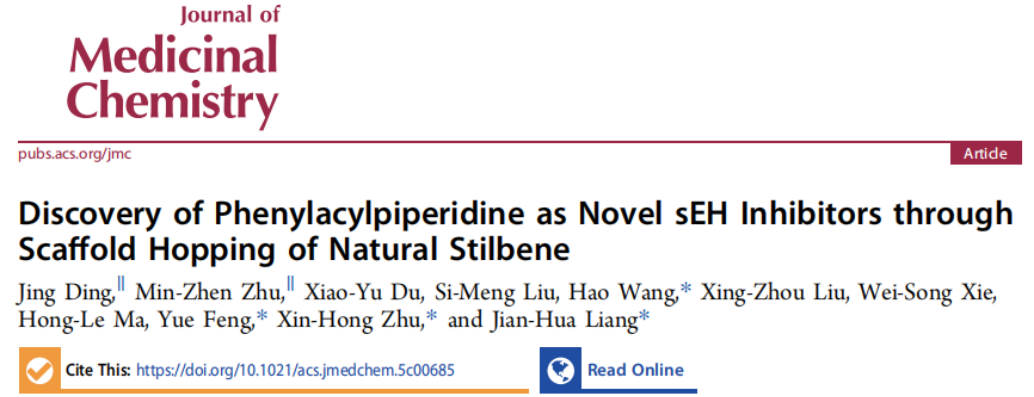 近日,日本A片 医药分子科学与制剂工程工信部重点实验室梁建华课题组,以天然产物二苯乙烯为先导物,基于骨架跃迁策略成功优选出一种“新型可溶性环氧水解酶”(sEH)抑制剂DJ-89(化合物77),为临床需求未满足的胰腺炎和关节炎的治疗带来新策略,2025年4月14日以“Discovery of Phenylacylpiperidine as Novel sEH Inhibitors through Scaffold Hopping of Natural Stilbene”为题在线发表在国际权威的新药研发期刊《Journal of Medicinal Chemistry》(文章链接://doi.org/10.1021/acs.jmedchem.5c00685)。该候选药物的体外sEH酶抑制活性(IC50低至0.51 nM)远高于现有临床候选药物EC5026;并在急性和慢性炎症动物模型中抗炎镇痛药效显著。在风湿性关节炎模型中DJ-89通过抑制肝脏中sEH酶活性,提高抗炎因子EET水平,有效减轻组织和关节的炎症症状,显著改善了动物的健康状况。与现有关节炎临床药物治疗方法相比,DJ-89具有新的作用靶标和生物途径,具有优异的临床安全性,这一研究成果为风湿性关节炎等自身免疫性疾病的治疗提供了全新的解决方案。