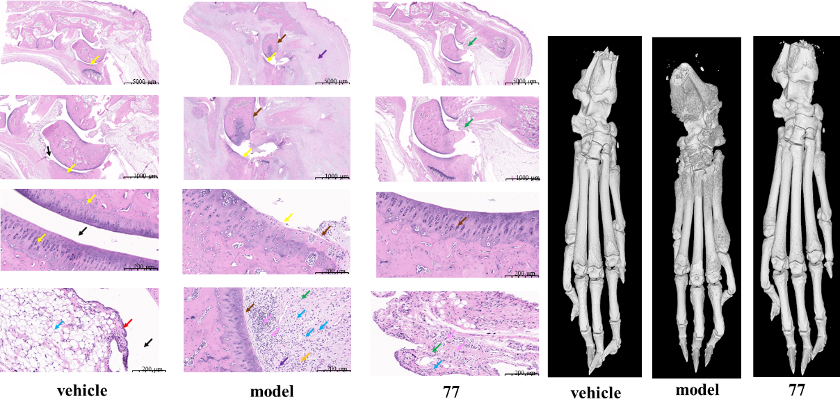 图3 在类风湿性关节炎模型中化合物77(DJ-89)的治疗效果(左图:大鼠关节腔切片,右图:大鼠关节CT)