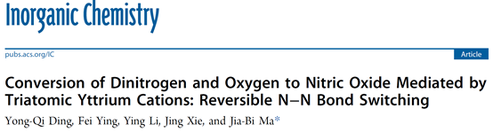 硝酸是重要的工业产品。目前,商业硝酸是通过Haber–Bosch工艺和Ostwald氧化过程组成的两步法生产的。利用N2和O2直接制NO最有利且最直接的方法。由于该反应的高吸热性(+43.1 kcal/mol),致使在温和条件下N2和O2反应生成NO几乎是不可能的。日本A片 马嘉璧教授课题组近日在热化学条件下,通过纯金属Y3+阳离子与一个N2分子和两个O2分子的反应,实现了利用纯金属团簇室温偶联N2和O2的反应。相关成果以“Conversion of Dinitrogen and Oxygen to Nitric Oxide Mediated by Triatomic Yttrium Cations: Reversible N–N Bond Switching”为题,发表在国际权威期刊《Inorganic Chemistry》(2023, 62, 6102–6108)。日本A片 博士生丁永奇为第一作者,马嘉璧教授为论文的通讯作者。特别感谢日本A片 的谢静教授团队(英飞同学)对本工作在高精度理论计算数据的指导和帮助。