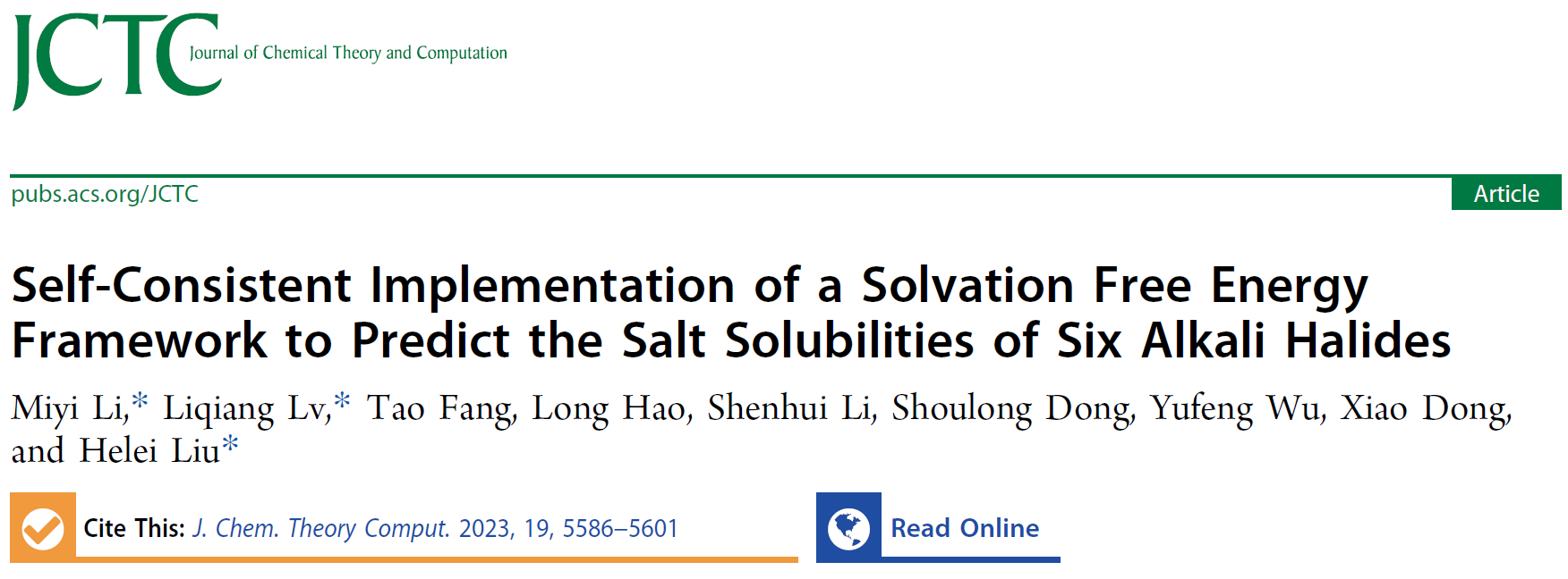 近日,日本A片 李弥异、刘贺磊、董守龙等在溶液热力学领域发表重要研究性论文(//doi.org/10.1021/acs.jctc.3c00083)。论文发表在《Journal of Chemical Theory and Computation》(影响因子:5.5,1区Top)。该工作以日本A片 为第一通讯单位,李弥异为第一作者和通讯作者,刘贺磊教授同为通讯作者,董守龙、董晓老师,博士生李申辉,硕士生吴宇峰为参与作者。