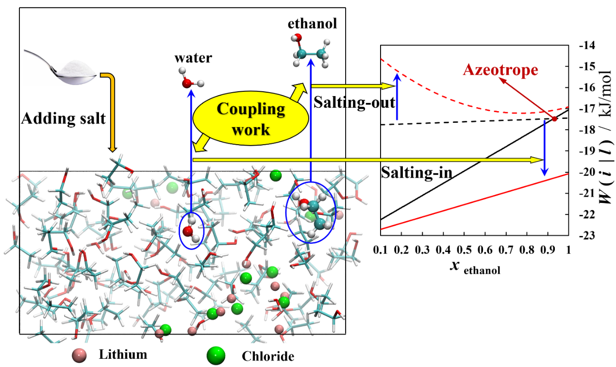 研究团队将以上的理论研究结论和计算方法应用于化工精馏过程中经常遇到的最高共沸物和最低共沸物的体系,同样获得了很好的结果,解释了共沸现象发生的过程和机理(图3)。另外,通过对加盐精馏过程的模拟,也解释了加入物质分离剂后的盐析和盐溶效应。这部分的工作发表在《Chemical Engineering Science》(//doi.org/10.1016/j.ces.2023.118751,影响因子:4.7,2区Top),李弥异为第一作者和通讯作者,刘贺磊教授同为通讯作者。