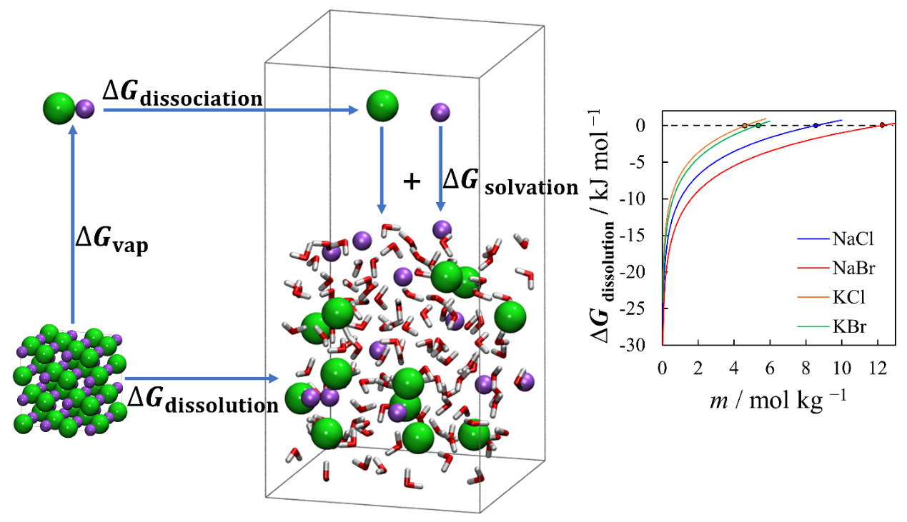 固体盐在溶剂中的溶解过程可等价的用蒸发,气相解离和溶剂化过程来描述(图1)。每一个独立步骤可由各物质的基础物理化学性质所计算,这使得模拟溶解过程以获得溶质溶解度的方法可通过满足热力学的自洽性来获得。基于此,高效和准确的分子动力学模拟流程在论文中被提出,新的和可靠的分子力场参数被关联出来。通过与实验数据对比发现,论文所提出的理论方法和计算公式能很好的描述盐的溶解度、活度系数、密度等性质,并且能精确的描绘出电解质溶液的微观结构与性质。通过研究也发现,现有的非极化力场对于极浓的体系(LiCl-水,20 mol/kg)不能很好的描述固液平衡行为,相关的工作将在后续完成。