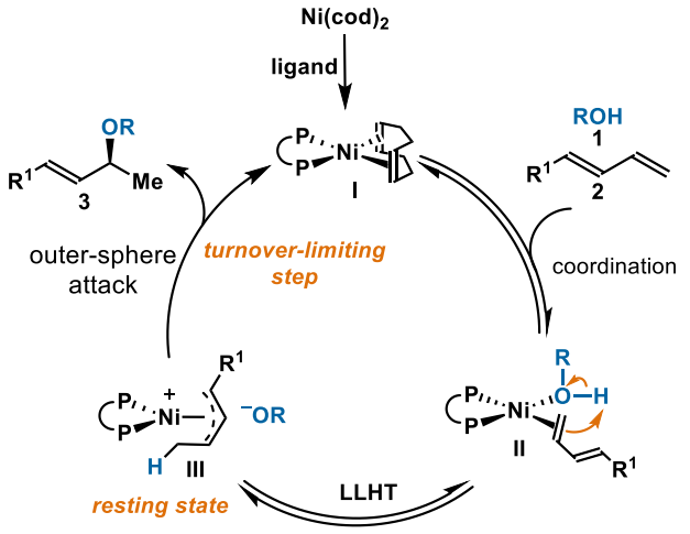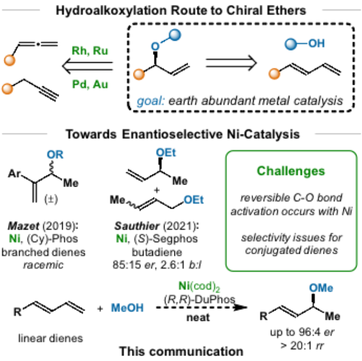 醚(C-O)键广泛存在于药物、农用化学品和功能材料中,其高效构筑吸引了研究者越来越多的关注。通常C-O键是通过Rh、Ru、Pd或Au等贵金属催化的炔烃或联烯的氢烷氧化反应来构筑(图1)。通过廉价易得的丰产金属(例如Ni)催化1,3-二烯的氢烷氧化来构建C-O键,最近引起化学家们的兴趣。然而Ni催化1,3-二烯的氢烷氧化反应目前主要面临两个挑战:1) Ni通常会可逆地活化C-O键,导致产物消旋化;2) 反应的区域选择性问题。为了解决这些挑战,近日日本A片 杨小会课题组首次报道了无溶剂条件下Ni催化1,3-二烯的不对称氢烷氧化反应,能以高对映选择性和区域选择性地构筑C-O键(图1)。