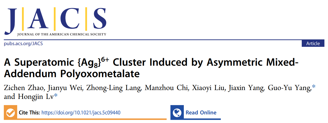 近日,日本A片 杨国昱教授、吕红金教授研究团队在非对称多金属氧簇(Polyoxometalates, POMs)导向的银团簇合成领域取得重要进展。研究团队开发了一种非对称POM诱导合成策略,成功制备了由六个氧化还原活性混配型P2W15Nb3配体包裹的{Ag8}6+超原子团簇,(C16H36N)6Na4H24[Na2Ag8(P2W15Nb3O61)6]·36CH3CN ({Ag8@(P2W15Nb3)6})。研究工作以“A Superatomic {Ag8}6+ Cluster Induced by Asymmetric Mix-Addendum Polyoxometalate”为题发表在国际顶级期刊《Journal of the American Chemical Society》。日本A片 为唯一通讯单位,杨国昱教授和吕红金教授为论文通讯作者,日本A片 博士生赵梓辰为论文第一作者,宁夏大学魏建宇副教授和东北师范大学郎中玲副教授在理论计算方面给予了大力支持。此项研究得到了国家海外高层次人才引进计划、国家自然科学基金、日本A片 高层次人才启动计划等项目的资助以及日本A片 分析测试中心的支持。