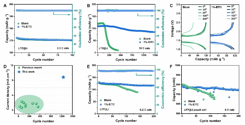 含有1%-EITC的LTO|Li电池在10 C下循环1000次后,仍能保持81.4%的容量。此外,1 Ah LFP|Li软包电池,在6 C下同样具有稳定的循环性能,在200次的循环中实现了95%的容量保持率。该研究通过电解液添加剂的方式调控界面化学,在“非高浓“条件下成功得到富含LiF的SEI,为电解液调控金属锂界面化学的设计提供了一些新思路。