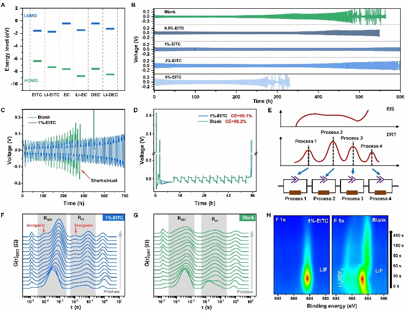研究通过理论计算和成分分析(XPS)确定了EITC在锂金属表面的自聚合行为,并通过Li||Li对称电池和Li||Cu半电池测试和验证了EITC对锂金属负极电化学性能的改善作用。不同电解液体系中锂金属负极的弛豫时间分布(DRT)分析和XPS分析发现,在EITC调控下的锂金属表面形成了富含LiF的SEI,而无添加剂组的SEI中存在大量LixPOFy中间产物。