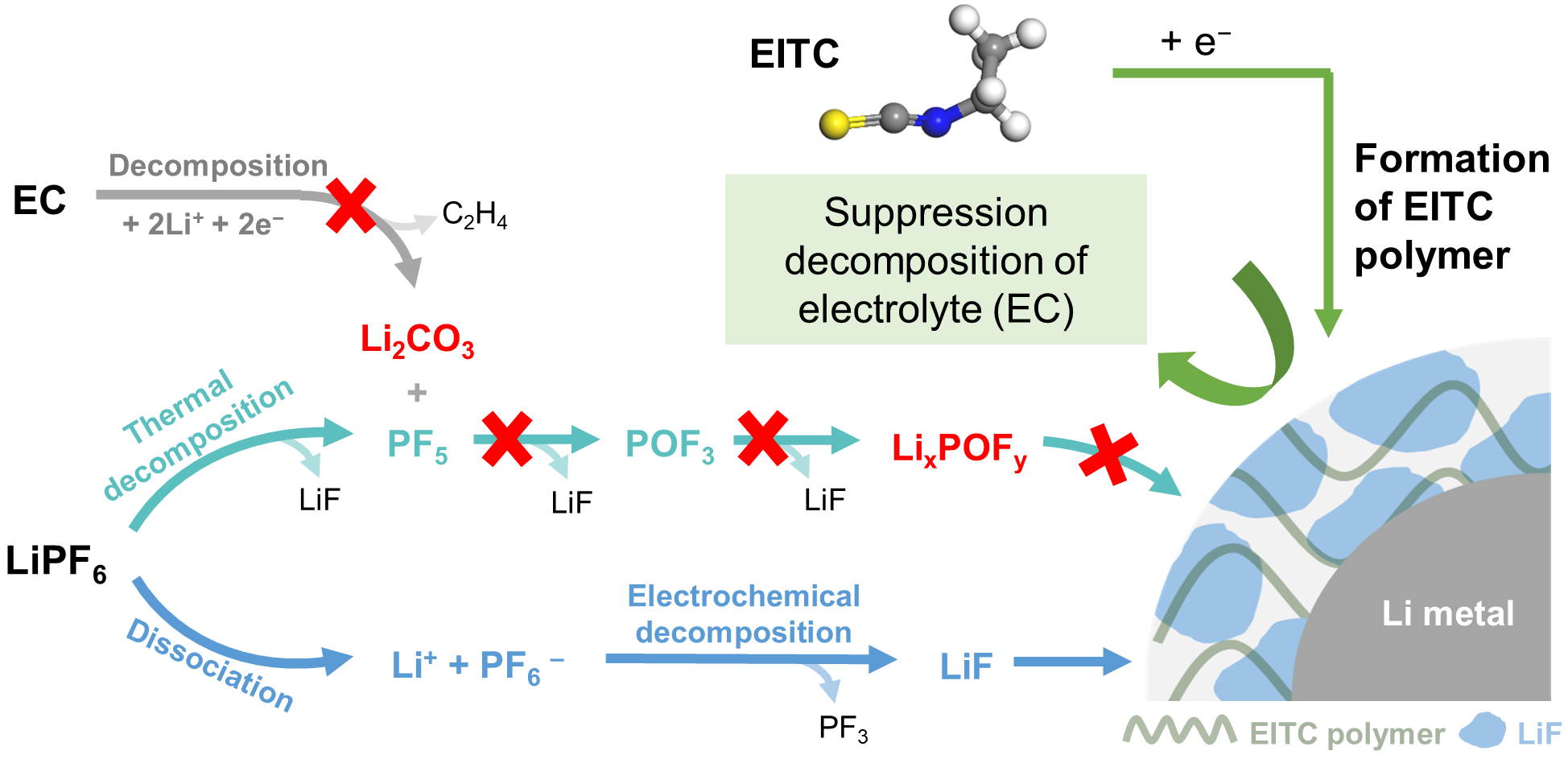 不同锂沉积量下锂金属的表面形貌以及锂成核沉积行为研究发现,在EITC参与形成的SEI下,锂更倾向于沿着平行电极的方向生长,形成“岛状”形貌,而非锂枝晶的“树枝状”形貌。进一步的理论计算、原位拉曼测试以及TOF-SIMS表征,证明了EITC在锂金属表面自聚成膜后会抑制EC分解,即减少Li2CO3的产生,进而影响LiPF6热分解路径的后续反应进程,不再产生LixPOFy;相反的,LiPF6的电化学分解路径持续进行,使得LiF在SEI中积累,最终在常规1 M锂盐浓度的碳酸酯电解液中,形成了富含LiF的SEI。
