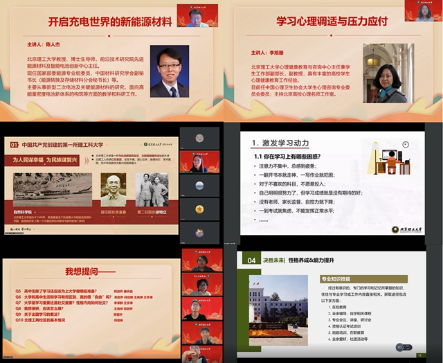 山西省晋城一中资深领航人吴芹副教授为新高二、新高三学生带来《相约北理·共筑梦想》的学校介绍;材料学院陈人杰教授以《开启充电世界的新能源材料》为题介绍了国内外新能源材料的发展历史及近期前沿研究,鼓励营员们关注科学前沿发展、未来投身科研领域;心理健康教育与咨询中心李旭珊主任通过互动交流,引导营员们正确认识压力,合理调试情绪并战胜各类挑战;云南、山西招生组副组长张锋以当前国内就业形势为背景,引导营员们通过自我探索,科学谋划、精准定位、提前明确自身目标,规划大学学习生活,并为他们分享如何提升个人技能的方法策略;思源学子志愿者们带领营员们云端参观了校史馆以及美丽的良乡校区,并通过线上沙龙就高中生们最关心的专业选择、大学生活、保研出国等10个问题进行了深入交流,为高中生们答疑解惑的同时,帮助他们了解真正的大学。