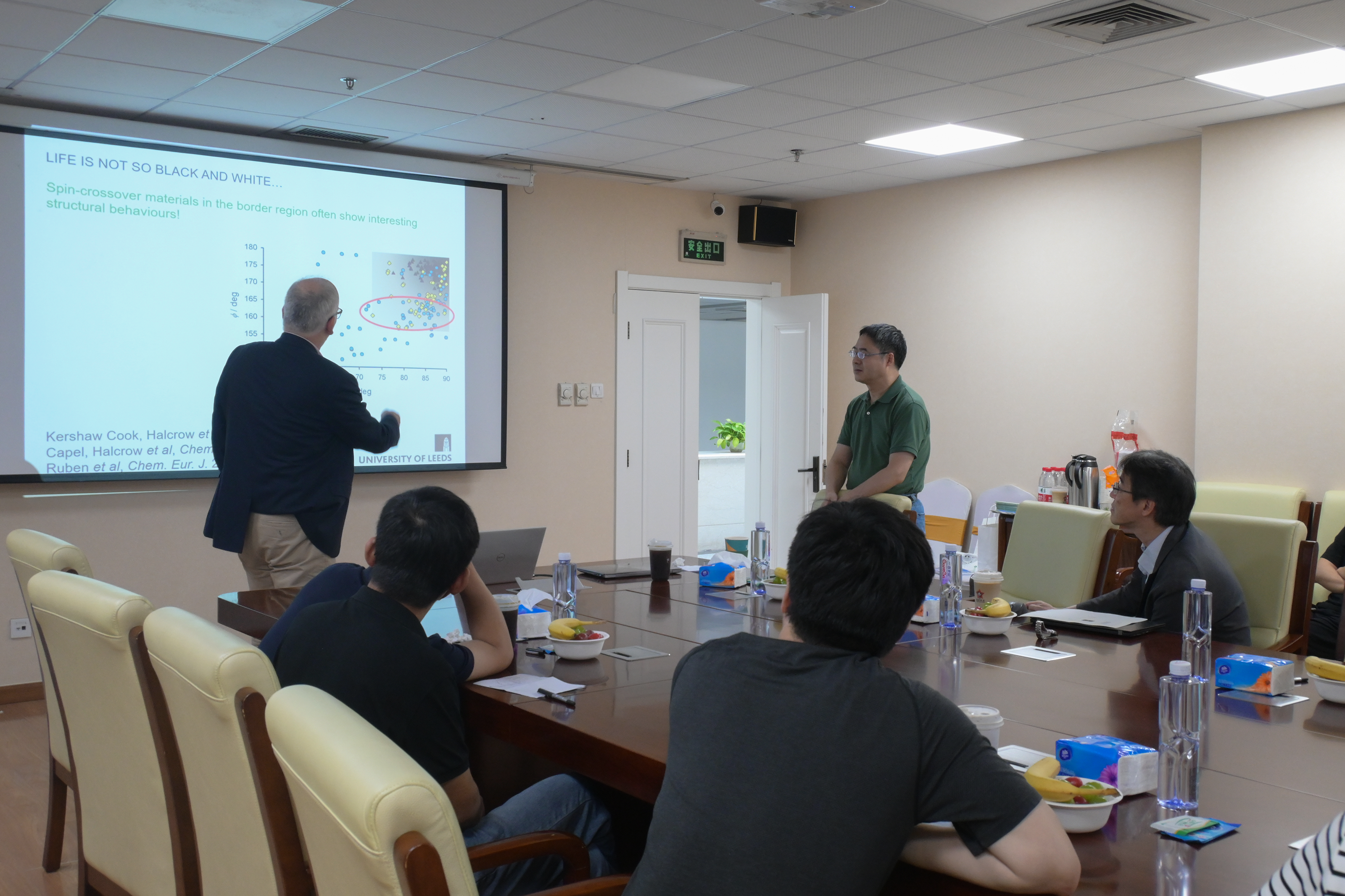 报告会上,Halcrow教授介绍了双稳态磁性开关材料高低自旋转变的理论机理,指出自旋交叉材料在存储器件、热传感器、光开关、压敏材料方面的潜在应用。Halcrow教授分享了三齿平面型配体分子构筑自旋交叉化合物、利用不发生自旋交叉同时具有和铁离子相同构型的锌离子作为参照研究自旋交叉行为的研究方法,并介绍了通过引入氢键有效控制自旋交叉行为,加深了参会师生对自旋交叉行为的理解,为进一步的研究提供了新的思路和参考。