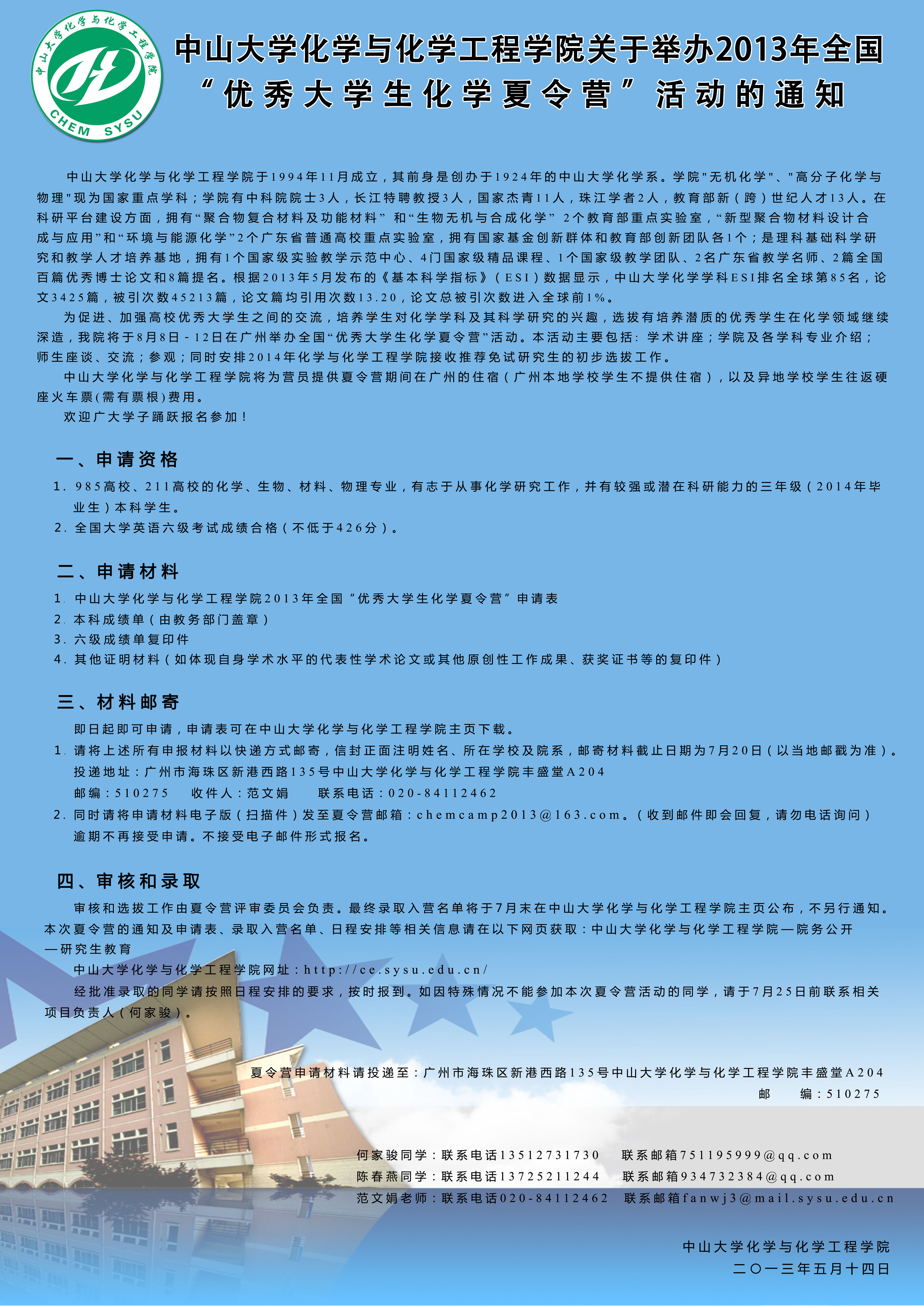 【化学学院】中山大学化学与化学工程学院关于举办2013年全国“优秀大学生化学夏令营”活动的通知