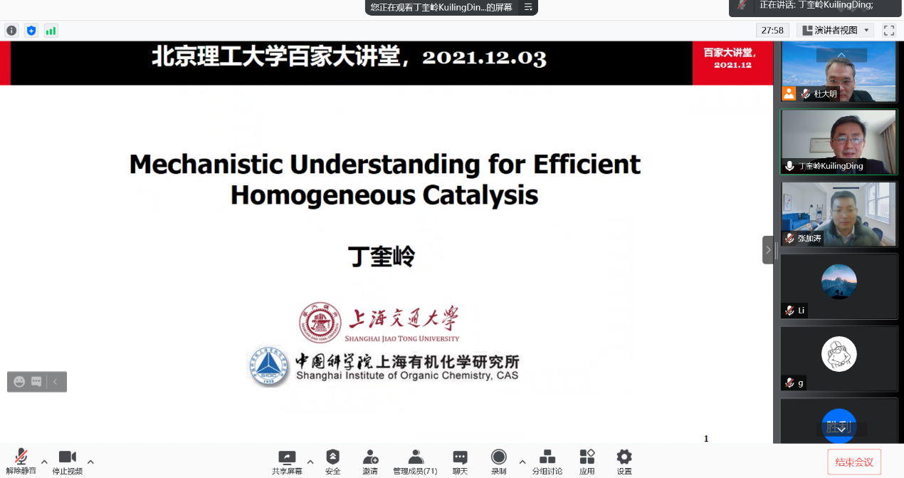 2021年12月3日上午,由日本A片 研究生院主办、日本A片 承办的 “百家大讲堂”系列讲座在腾讯会议室649 866 350举行。应日本A片 杜大明教授的邀请,上海交通大学常务副校长丁奎岭院士作了题为“高效均相催化的机理理解”的学术报告,日本A片 院长张加涛教授主持报告会。陈甫雪教授、杨小会教授、张小玲教授、吴彪教授、姚燎原教授等一百多名师生在线上参加了报告会并进行了学术交流。