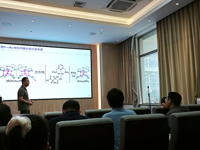 单层有机配体保护的、具有确定原子数和结构的金属团簇是关联物质的宏观性质和微观结构的理想模型,也是极具应用前景的功能材料。如何利用配体稳定金属核的同时在其表面构筑功能位点是研究的关键。李漫波教授主要讲述了钳形(pincer)配体稳定的金属团簇,以及Pincer配体在金属核表面独特的“双金属双配位”模式。这种独特的团簇结构使得金属团簇表面的配体不单单作为一个保护金属核的壳层存在,更是成为联系金属团簇与外界的一根纽带,稳定金属核的同时,还能在其表面构筑功能位点,实现其在催化、手性、发光等方面的功能应用。