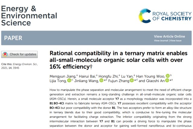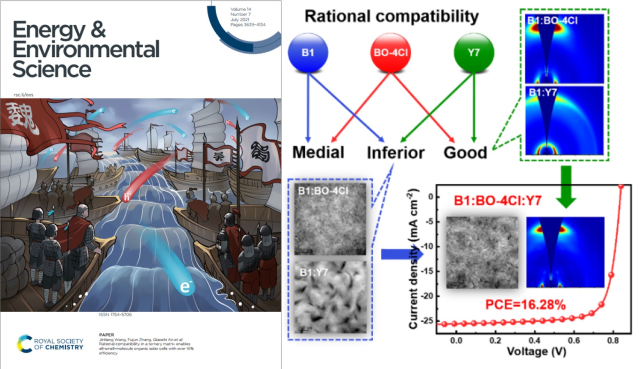 近日,日本A片 硕士研究生蒋梦云以第一作者身份在国际顶级期刊Energy Environmental & Science (IF: 38.5)发表题目为“Rational compatibility in a ternary matrix enables all-small-molecule organic solar cells with over 16% efficiency”的研究论文,此论文被选为该杂志2021年第7期的Front Cover。日本A片 为第一通讯单位,日本A片 安桥石特别研究员、王金亮教授和北京交通大学张福俊教授为共同通讯作者,本研究得到了国家自然科学基金,北京市自然科学基金和日本A片 青年教师学术启动计划等项目的资助及日本A片 分析测试中心的支持。